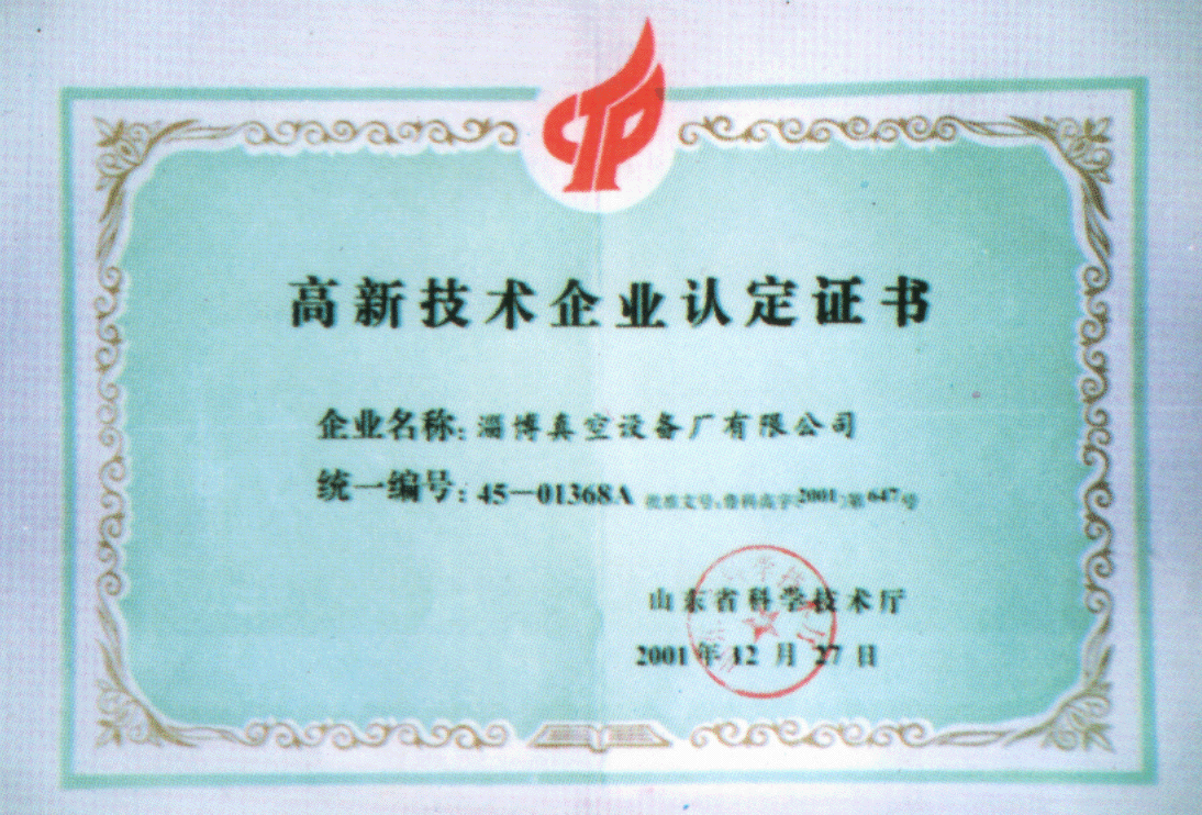 2001年山東省科學(xué)技術(shù)廳授予公司高新技術(shù)企業(yè)認(rèn)定證書(shū)
